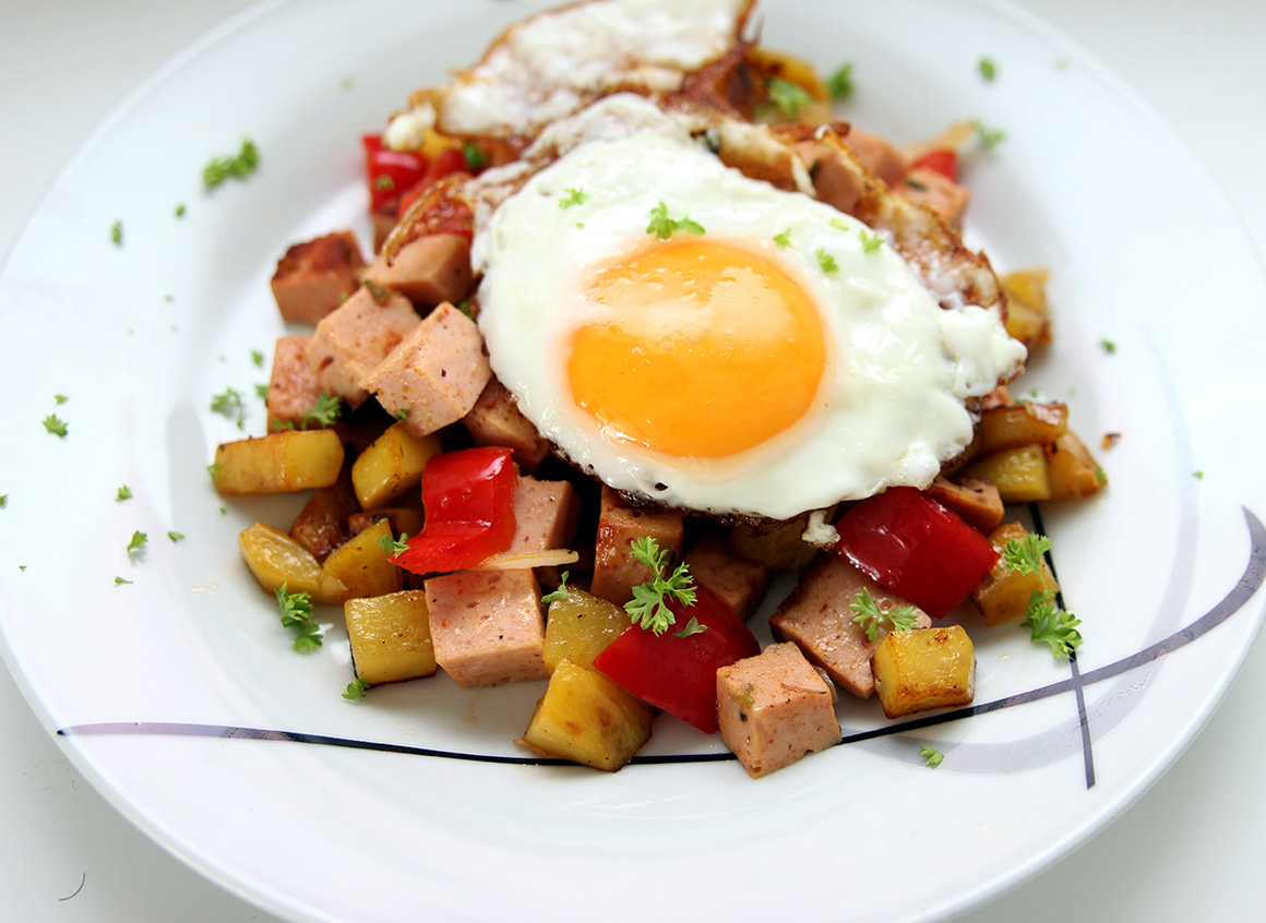 Leberkäs ist nicht nur in der Semmel ein echter Genuss, auch gebraten mit Kartoffel, Paprika und Ei ist Leberkäse ein köstliches und schnelles Gericht.